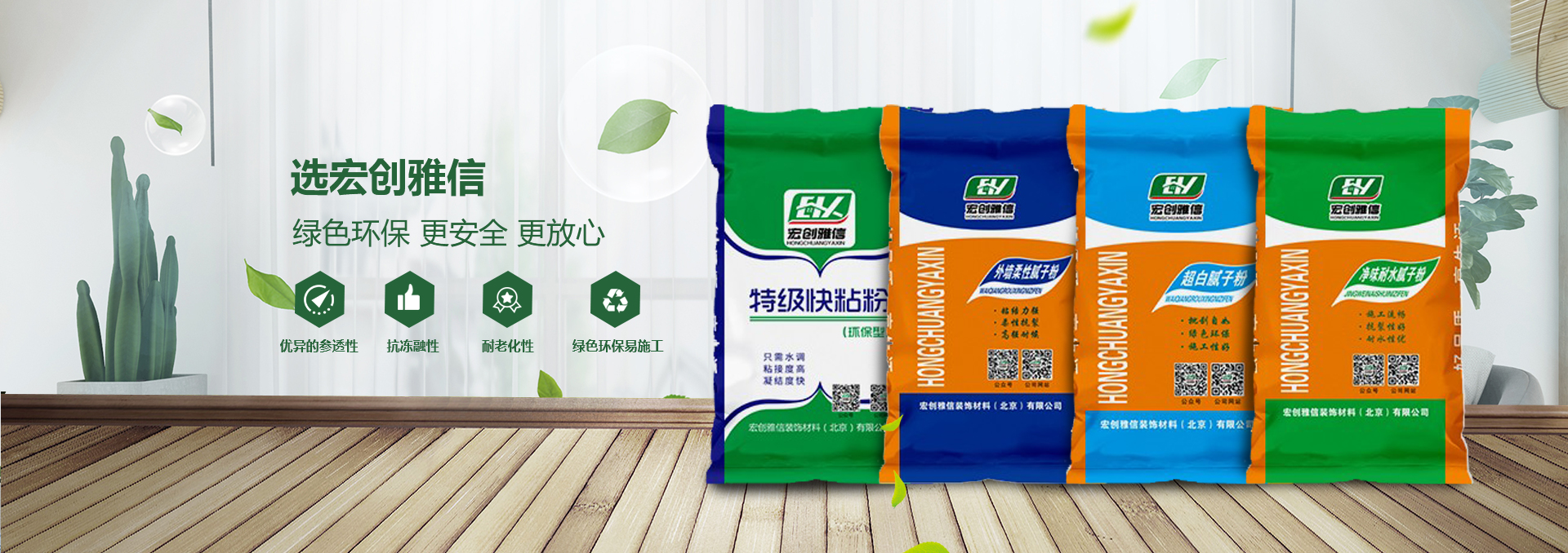 宏創雅信裝飾材料北京有限公司(威海分公司)是一家生產,研發,運輸,施工綜合性股份制企業,主要產品:快粘粉、嵌縫石膏、內外墻耐水膩子粉、內墻超細膩子粉、高強石膏、粉刷石膏、瓷磚粘接劑、填縫劑、內外墻防水涂料、108膠、聚合物粘接砂漿、聚合物抗裂抹面砂漿、灰鈣、重質碳酸鈣、砌筑砂漿、膠粉聚苯顆粒、浮雕骨料、玻化微珠保溫砂漿、FTC相變節能保溫砂漿、SF增水保溫砂漿、等產品。